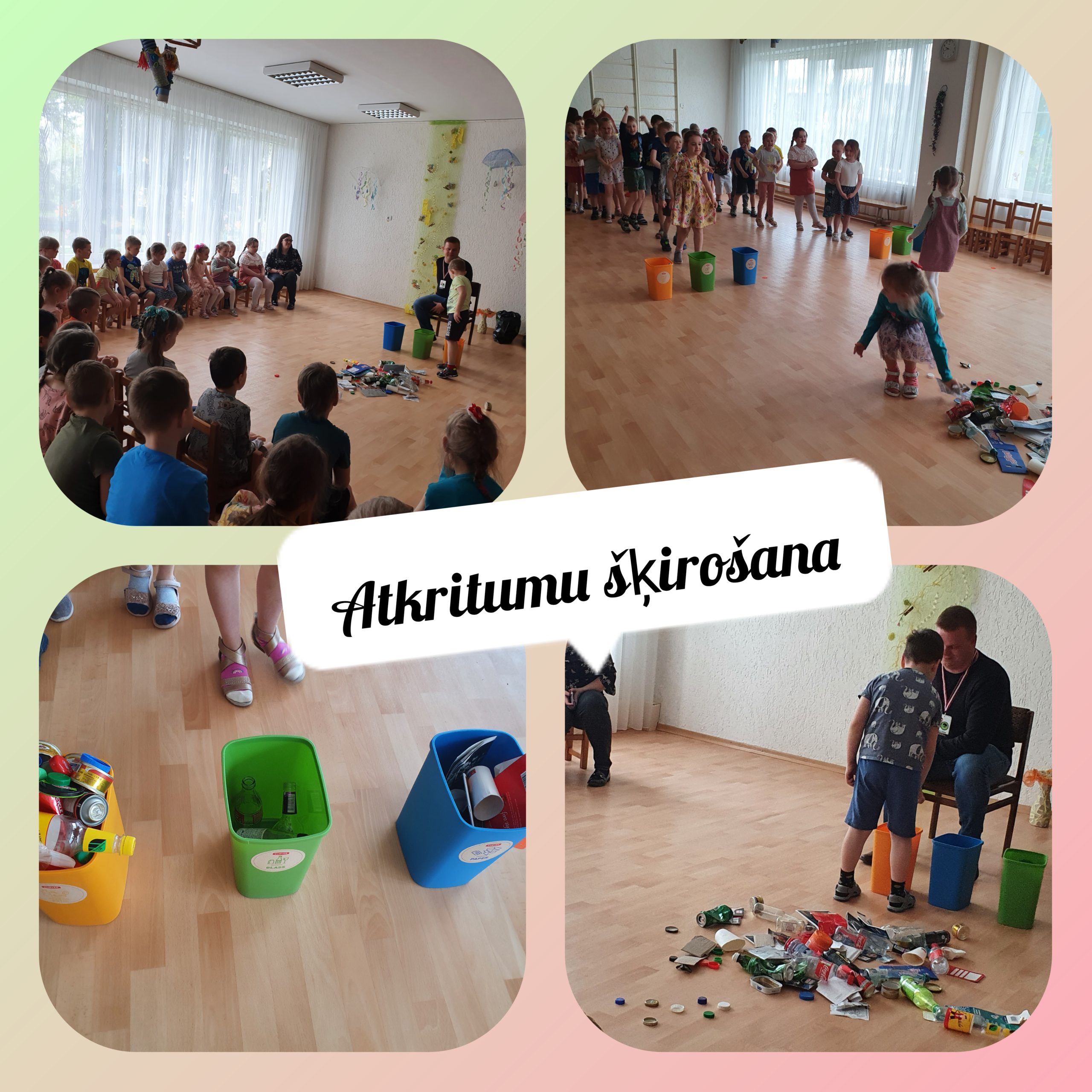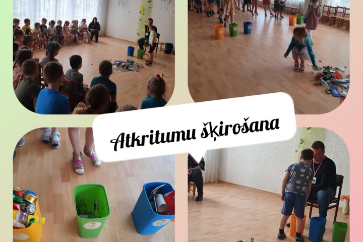 Martā pie mums viesojās arī SIA,,AADSO” pārstāvis , kurš novadīja 5-6 gadīgo grupu audzēkņiem praktisko nodarbību par sadzīves atkritumu šķirošanu. Bērni mācījās šķirot atkritumus pēc konteineru krāsas: zils- papīram, dzeltens- plastmasai/metālam, zaļš-stiklam.